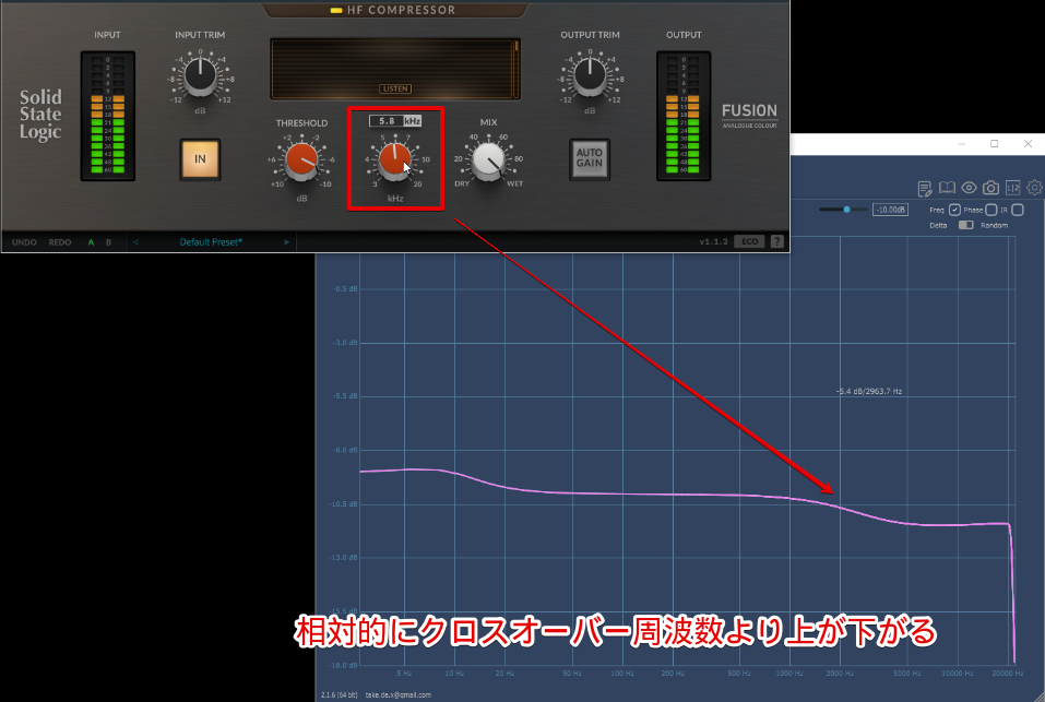 SSLの「Fusion HF Comp」というもので、指定周波数以上の音に対してコンプをかけるというのに特化したプラグイン。