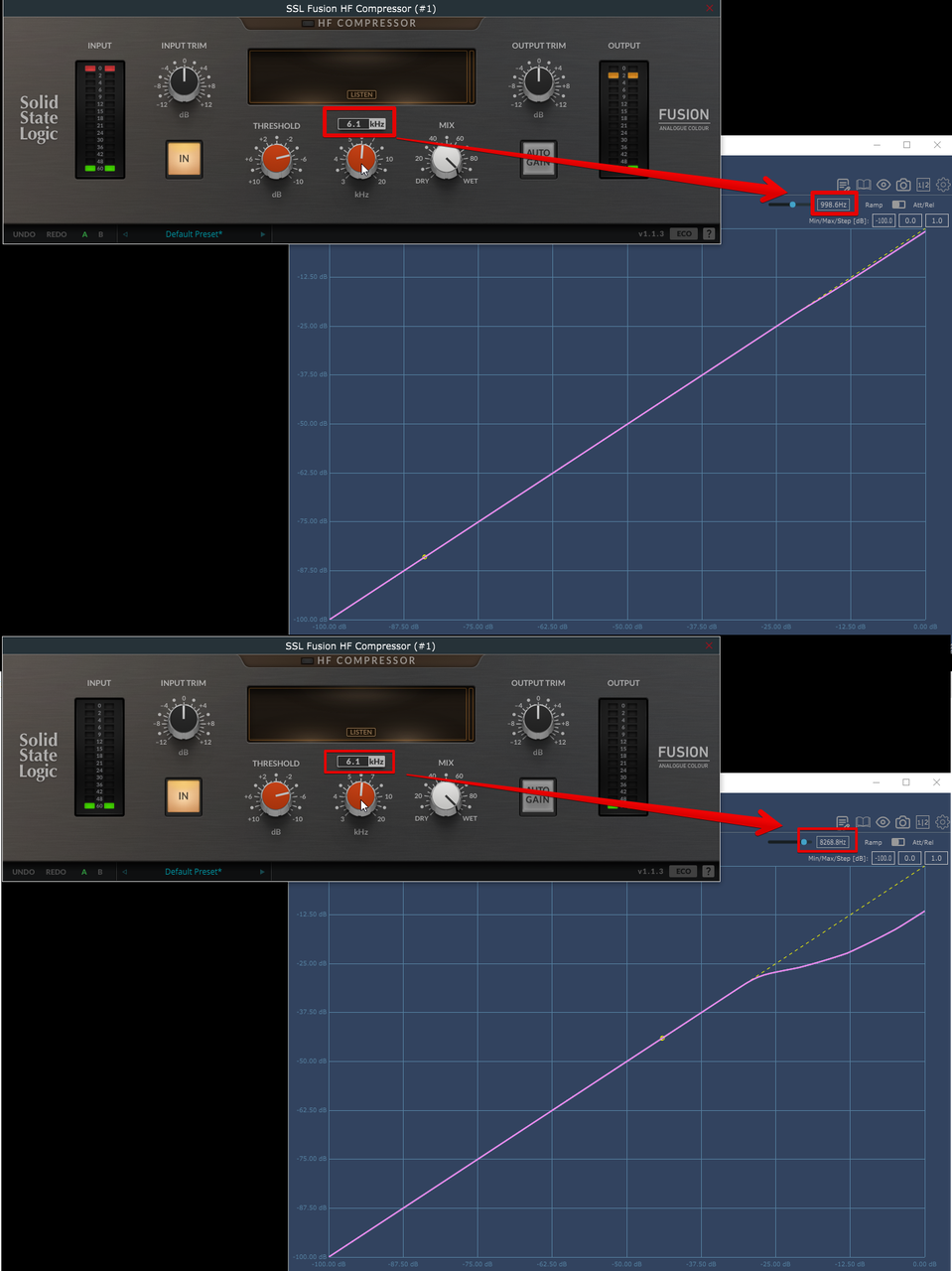 クロスオーバー周波数未満だと圧縮がかからず、クラスオーバー以上だと圧縮がかかっていることがわかる。